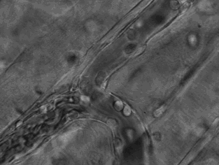 下圖像「卜」字形水管的物體是顯微鏡底下的血管,血管下端流動很快速的顆粒是血液,而上方緩慢移動的透明白色小球則是免疫細胞,這是免疫細胞偵測到身體發生炎症和創傷組織的地方,穿過血管壁奔赴戰場的顯微攝影。