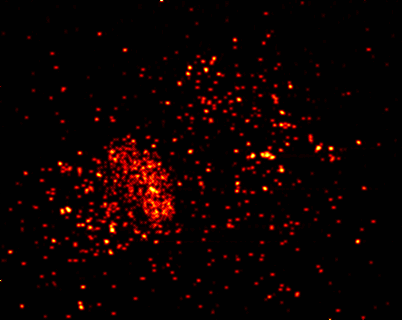 以下的紅點是被紅色螢光標註的免疫細胞,可以看到免疫細胞辨認出癌細胞後,透過抗原-抗體結合包圍癌細胞,再瓦解消滅癌細胞的過程。