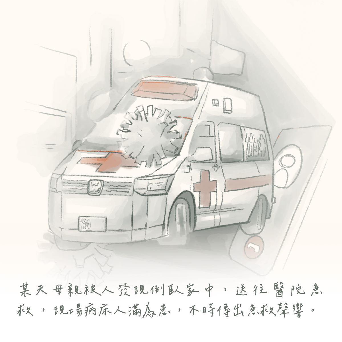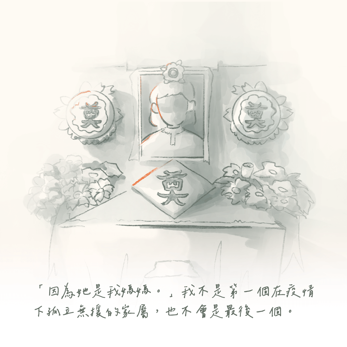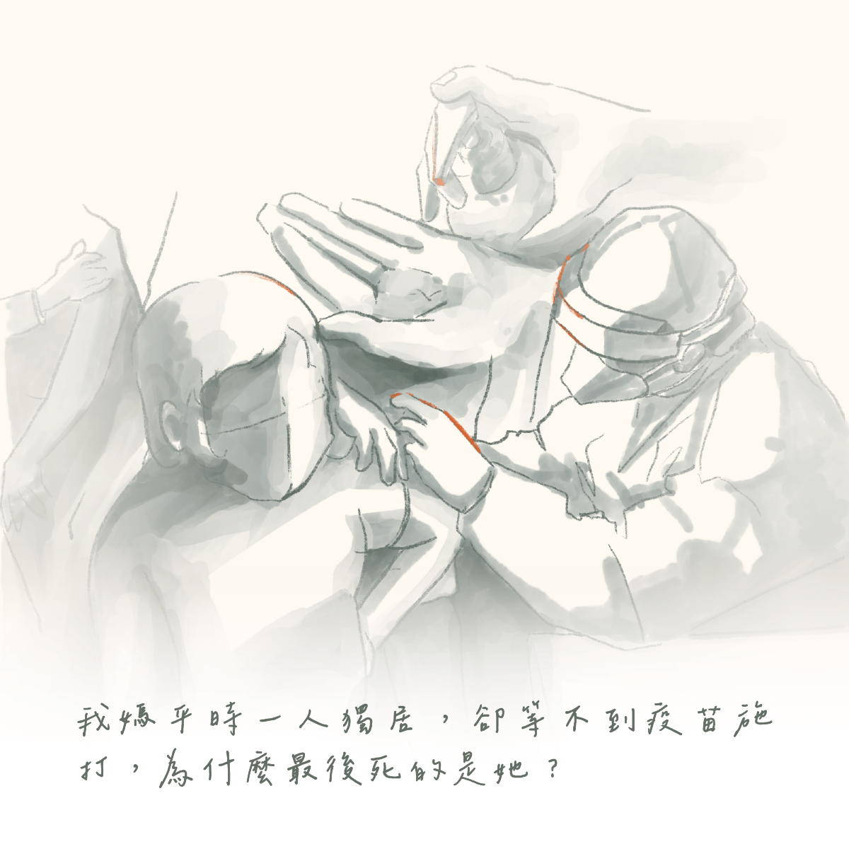 高齡族群是疫情下,傷亡最慘重的一群。W 先生的母親患有慢性病,在 2020 年疫情大爆發被驗出罹癌,需多次進出醫院回診拿藥,染疫風險高,但疫情之下卻搶不到疫苗可打,最後確診染疫過世,過程中經歷急救、插管、搶藥、火化的衝擊,讓家屬孤立無援,至今難以釋懷。