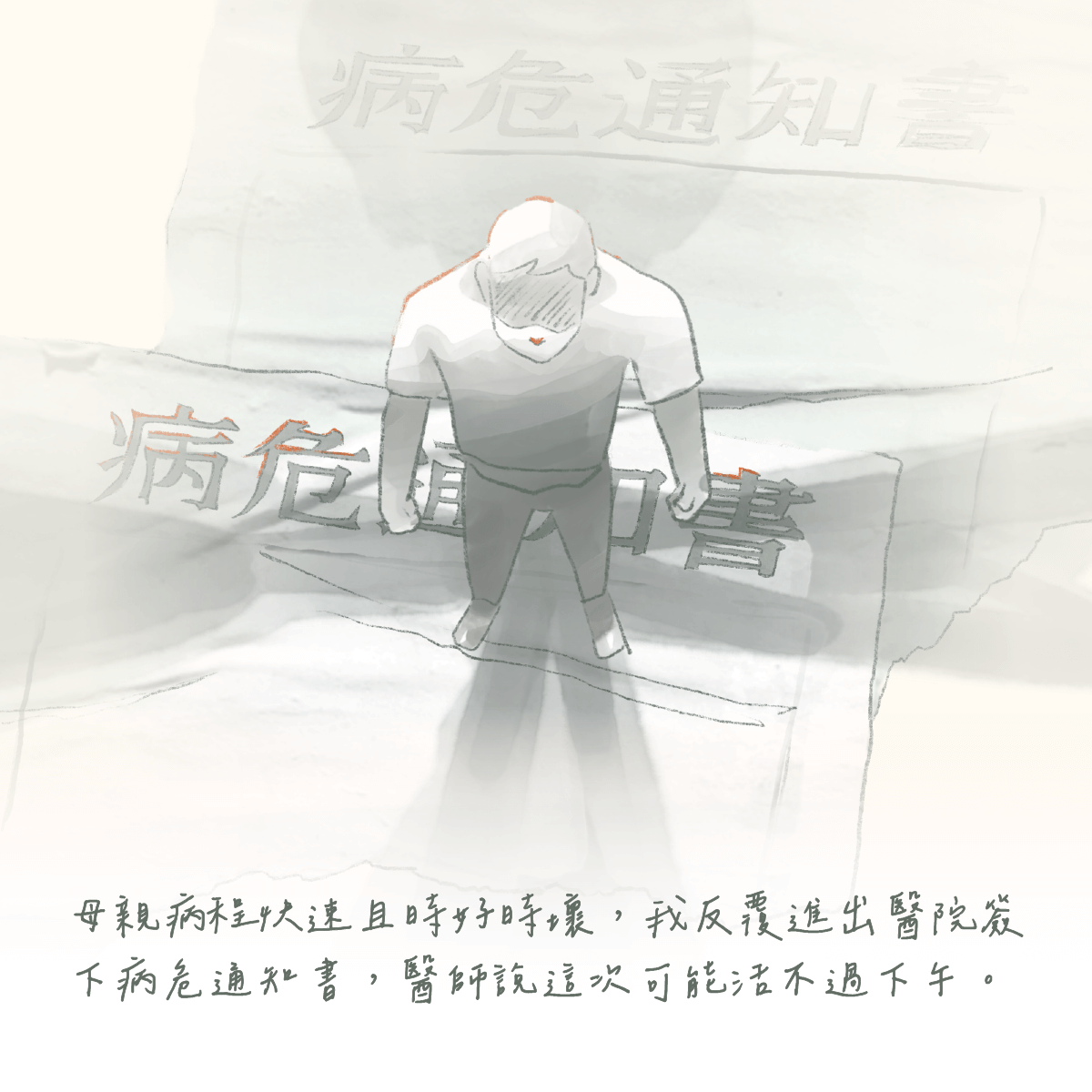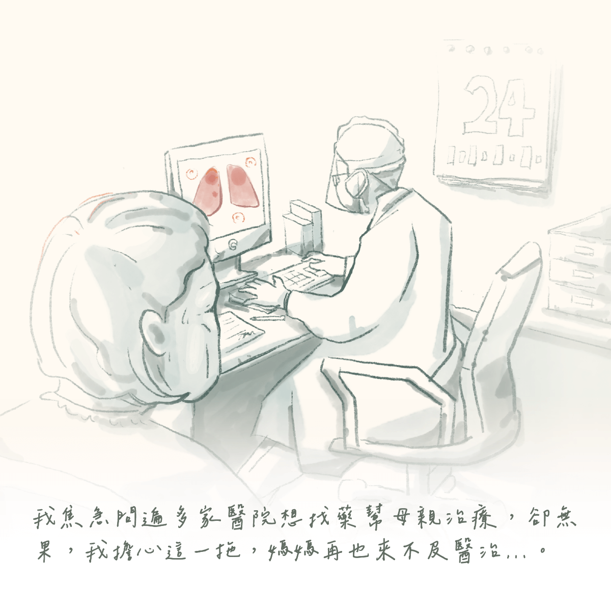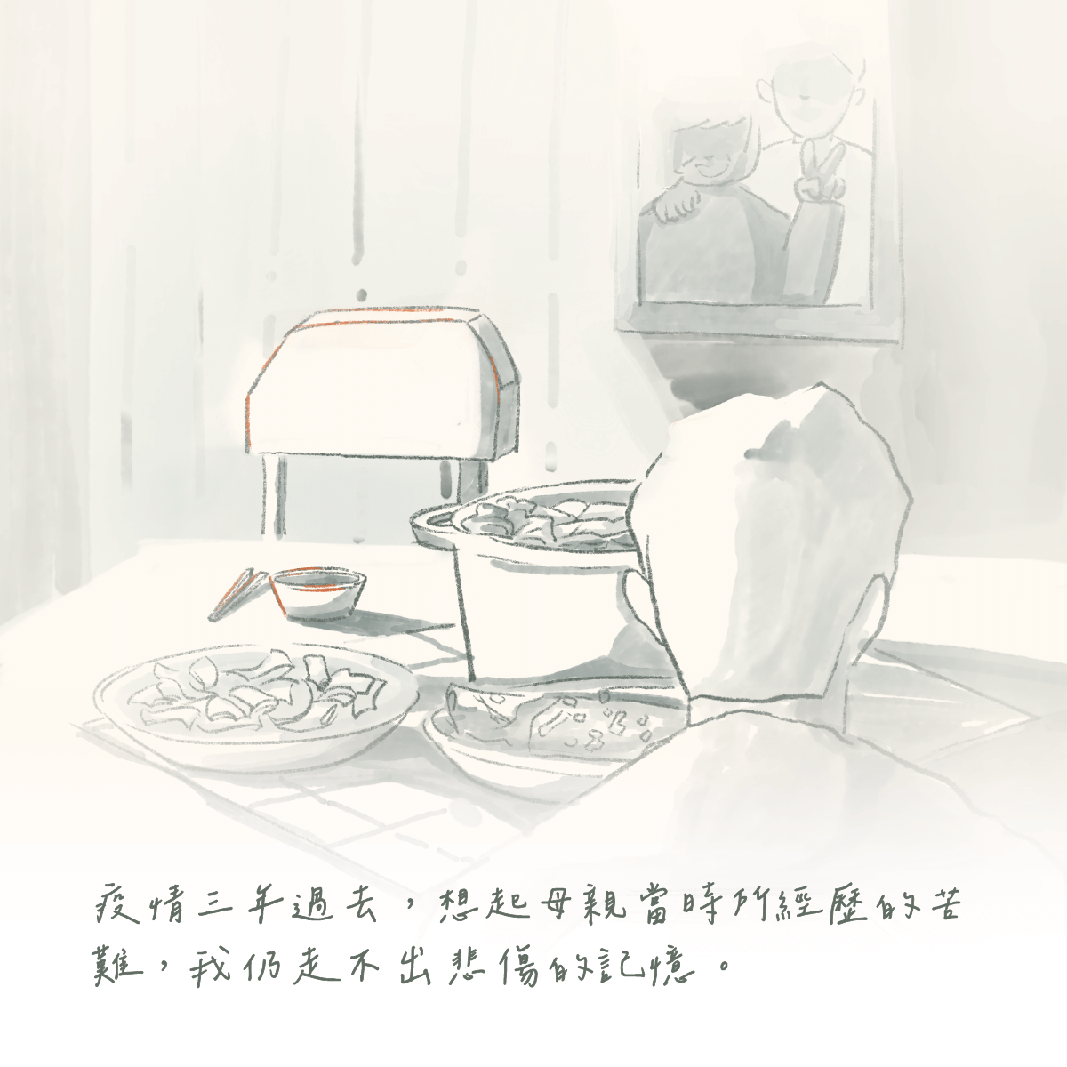 高齡族群是疫情下,傷亡最慘重的一群。W 先生的母親患有慢性病,在 2020 年疫情大爆發被驗出罹癌,需多次進出醫院回診拿藥,染疫風險高,但疫情之下卻搶不到疫苗可打,最後確診染疫過世,過程中經歷急救、插管、搶藥、火化的衝擊,讓家屬孤立無援,至今難以釋懷。